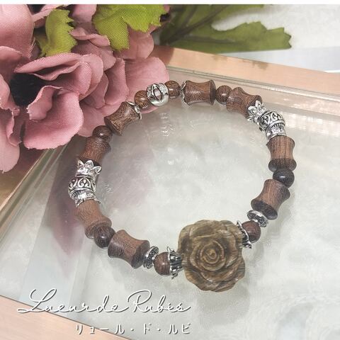 華やぎを添える金糸檀木ローズ彫り入り メタル調パーツ+ジルコン入りロンデル4+X型ロンデル|ブレス16cm