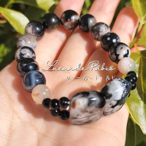 ◆夜桜瑪瑙の四角パーツと丸玉をメインに使用したこのブレスレットは、深いブラックやピンクの色合いが特徴的で、夜空に咲く桜のような美しさを持っています。サポートストーンとして、オニキスと桜瑪瑙を組み合わせ、さらにアクセントとしてゴールドオブシディアンを加えることで、全体に調和と深みをもたらしています。